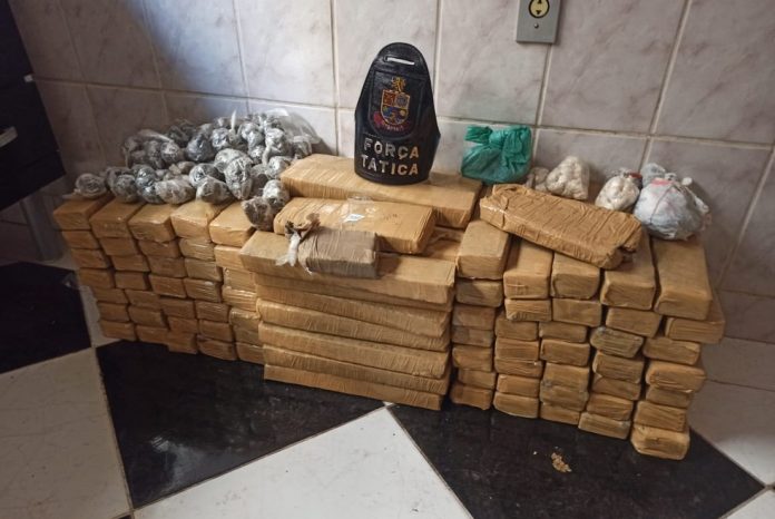A PM chegou ainda a um terceiro imóvel, onde foram localizados 109 tijolos de maconha, além de 1.622 porções menores da droga, 936 pedras de crack, meio tijolo de cocaína, três balanças de precisão e embalagens para as drogas.