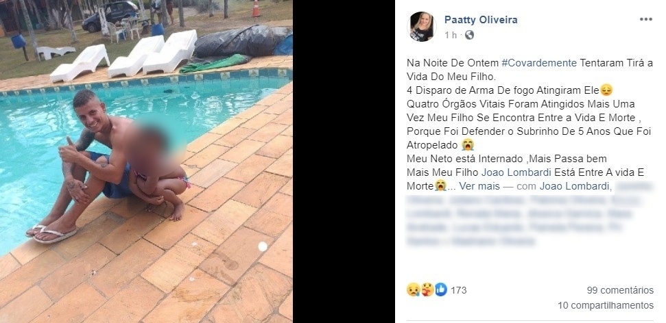 Nossa reportagem falou por telefone com Patrícia Oliveira, mãe da vítima, que nos disse que seu filho teve quatro órgãos vitais atingidos, e encontra-se entre a vida e a morte. Ainda de acordo com ela, o rapaz levou os tiros após discussão para defender sobrinho de 5 anos que foi atropelado pelo autor dos disparos. Ela também relatou o fato nas redes sociais.