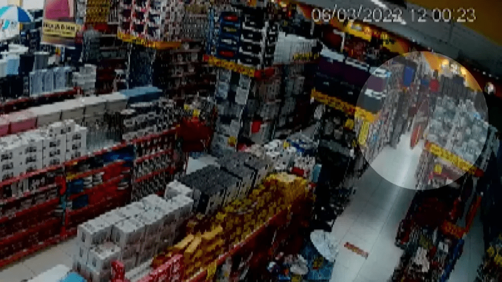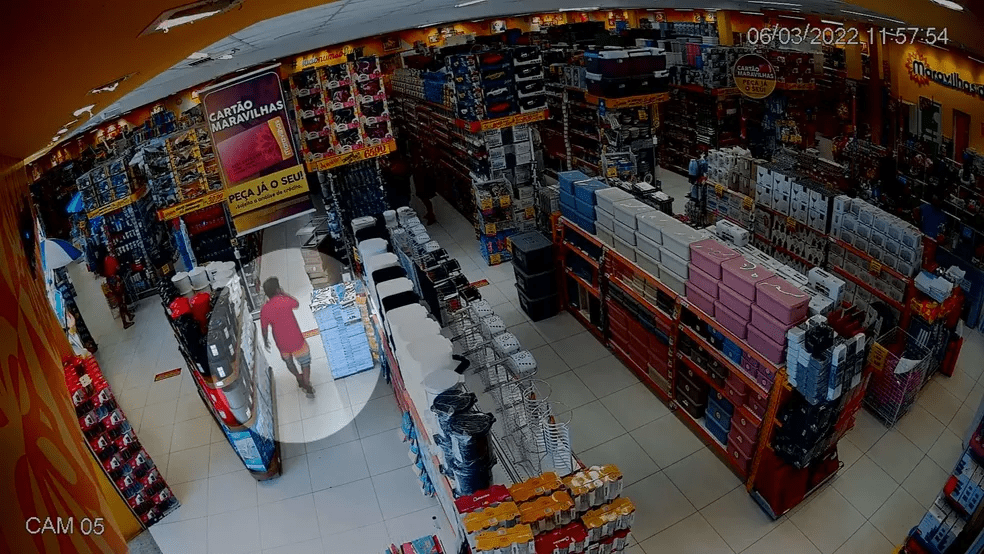 O crime aconteceu no domingo (6). As imagens mostram quando o homem usando camisa rosa e bermuda entra na loja, por volta das 11h57, e cobre parte do rosto com as mãos, porque está sem máscara. Ele observa as pessoas e segue para o fundo da loja.
