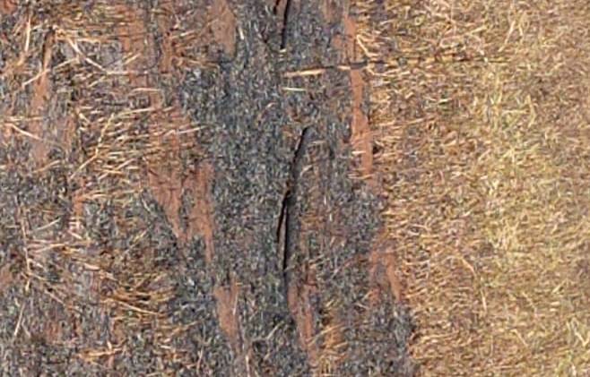 O proprietário de uma área rural estava tentando apagar um foco de incêndio em sua plantação de feno, quando ouviu um gemido, ao se aproximar de onde vinha o barulho encontrou o corpo.