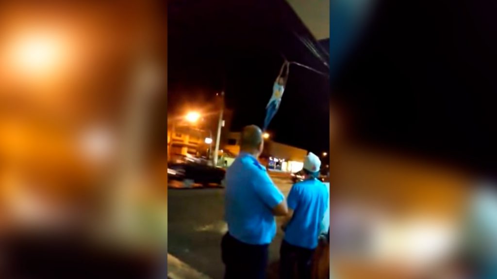 Um vídeo que circula nas redes sociais mostra um homem pendurado em fios da rede elétrica na frente do Terminal Central de Londrina (PR). A cena foi gravada na noite desta segunda-feira (11) por usuários que estavam no local.