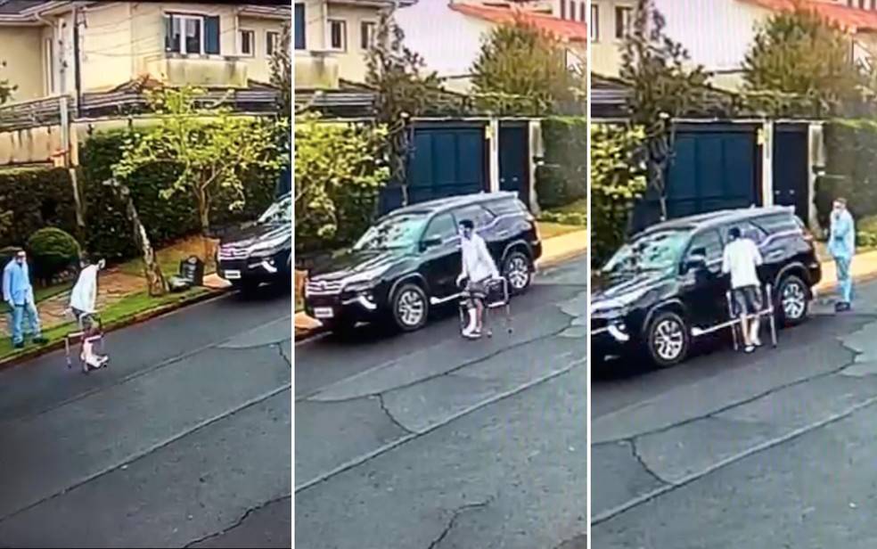 Na sequência, a dupla volta e o indivíduo com o andador entra no carro pela porta do motorista, enquanto o outro entra pelo lado do passageiro. Os dois ficam alguns instantes dentro do veículo e depois vão embora nele.