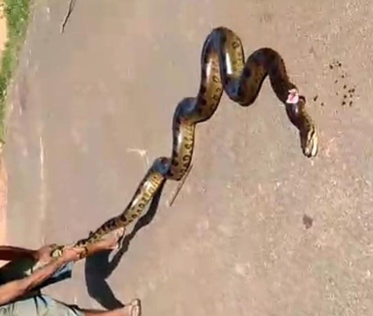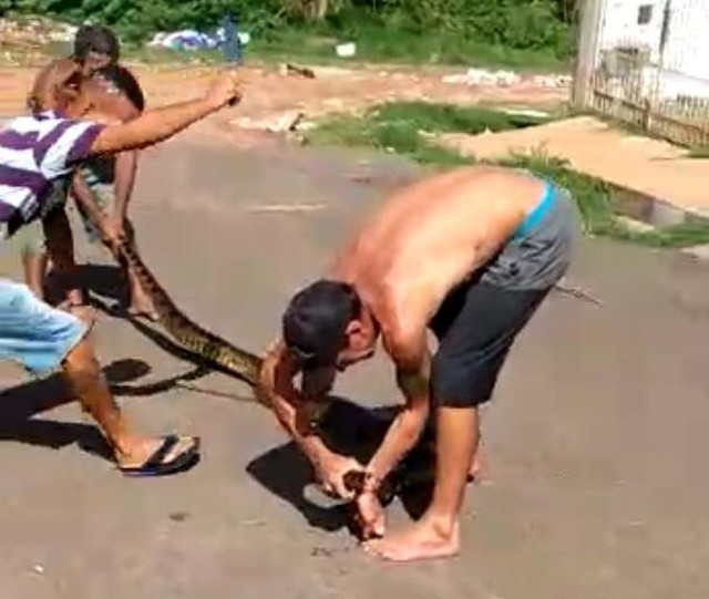 Nas imagens, um dos homens aparece arrastando a cobra pelo rabo em uma das ruas do Jardim Bom Viver V. Um outro se aproxima e, para se defender, o animal dá uma mordida no braço dele.