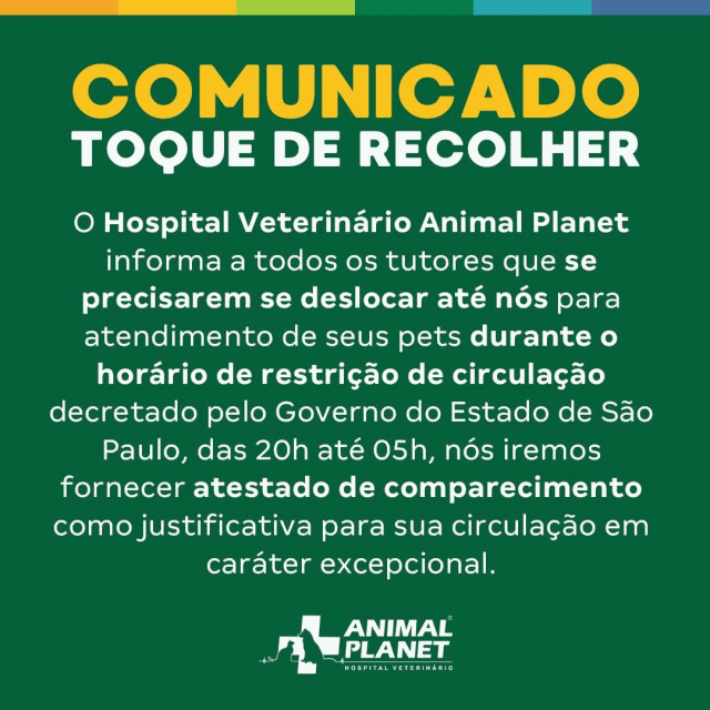 O Hospital Animal Planet, o primeiro hospital veterinário de Araras (SP), emitiu um comunicado informando todos os tutores que se precisarem se deslocar até o hospital, para atendimento de seus pets durante o horário de restrição de circulação decretado pelo Governo do Estado de São Paulo, das 20h até às 5h, que eles estão fornecendo atestado de comparecimento como justificativa para sua circulação em caráter excepcional.