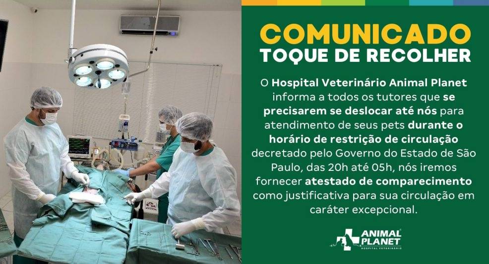 O Hospital Animal Planet, o primeiro hospital veterinário de Araras (SP), emitiu um comunicado informando todos os tutores que se precisarem se deslocar até o hospital, para atendimento de seus pets durante o horário de restrição de circulação decretado pelo Governo do Estado de São Paulo, das 20h até às 5h, que eles estão fornecendo atestado de comparecimento como justificativa para sua circulação em caráter excepcional.