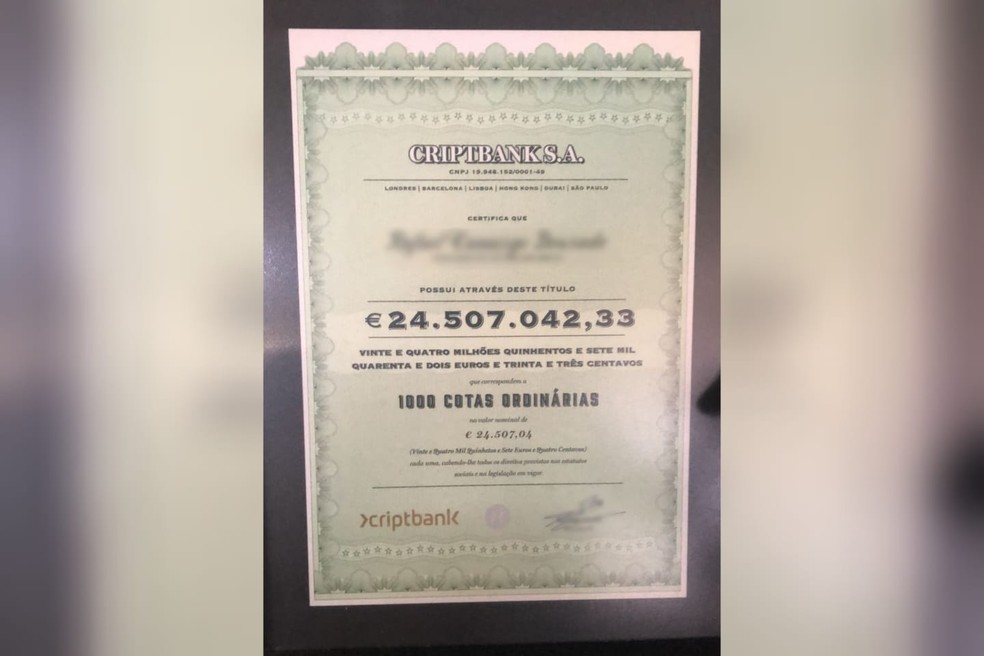 Um dos presos na operação tinha “um certificado” de uma conta com mais de R$ 140 milhões. Além do certificado, que contém o valor em Euros, as equipes também encontraram duas moedas, que são usadas como símbolos e que não possuem valor atrelado.
