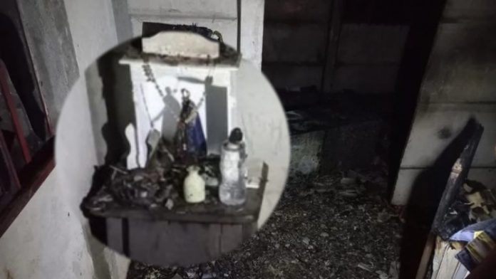 Na foto compartilhada pela equipe, é possível ver que a imagem da santa e um terço estão em um altar, que também parece não ter sido afetado pelas chamas. O cômodo onde as peças estavam ficou visivelmente queimado, assim como um item que estava acima do altar.