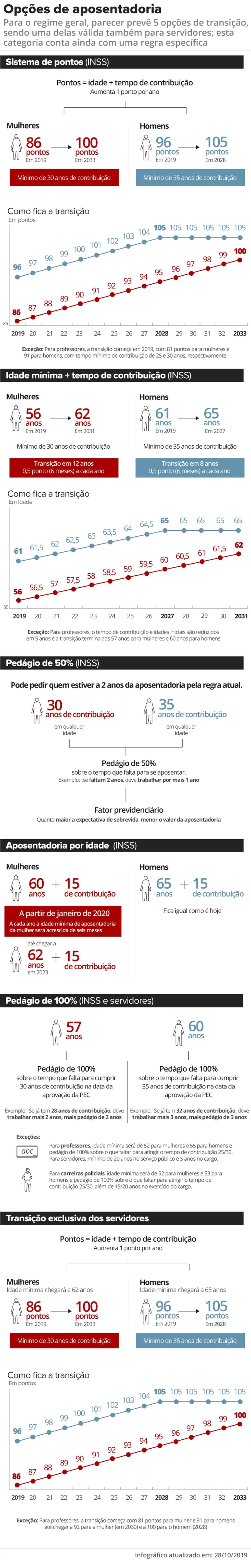 Nessa regra, para os homens, a idade mínima continua sendo de 65 anos. Para as mulheres começa em 60 anos. Mas, desde 2020, a idade mínima de aposentadoria da mulher é acrescida de seis meses a cada ano, até chegar a 62 anos em 2023. O tempo mínimo de contribuição exigido é de 15 anos para ambos os sexos.