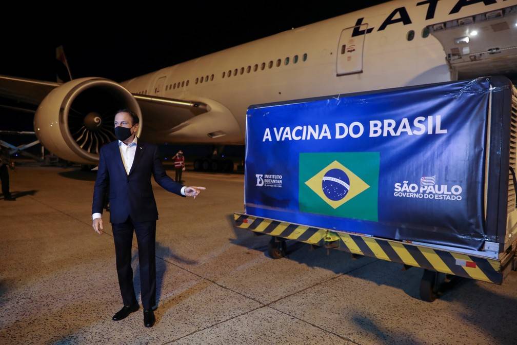 O desembarque contou com a presença do governador de São Paulo, João Doria (PSDB), do secretário de Saúde do estado, Jean Gorinchteyn, e do diretor do Instituto Butantan, Dimas Covas.