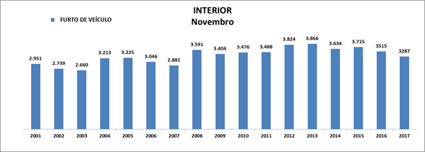 Também houve queda de 6,49% nos furtos de veículos. O total diminuiu de 3.515 para 3.287, sendo o menor para o mês de novembro desde 2007.