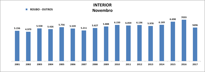 Os furtos em geral tiveram redução de 7,60%, com 22.367 registros. Em novembro do ano passado foram contabilizados 20.667 casos.
