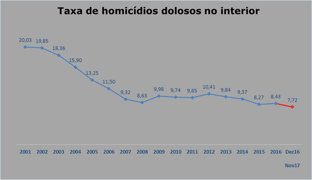 Com as variações, as taxas de homicídios chegaram a 7,72 casos e 8,17 vítimas a cada grupo de 100 mil habitantes – nos últimos 12 meses, de dezembro de 2016 a novembro deste ano. Ambas são as menores da série.