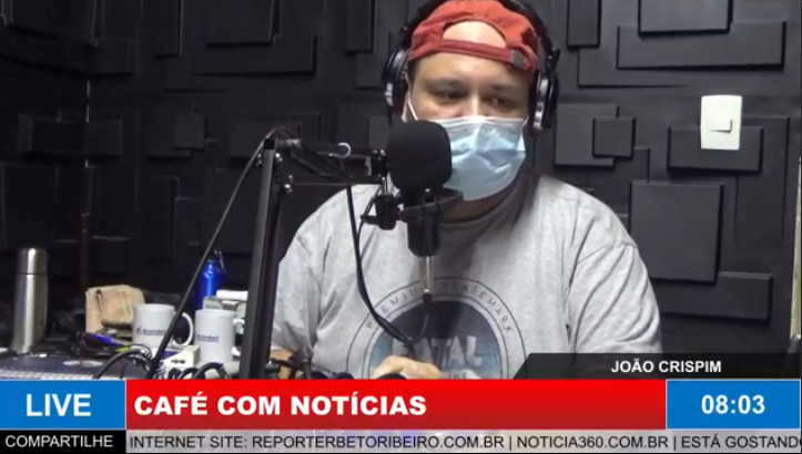 O jornalista e apresentador do programa CAFÉ COM NOTÍCIAS, João Crispim, confirmou no início da tarde desta terça-feira (29) ao Repórter Beto Ribeiro, seu companheiro de trabalho, que testou positivo para a Covid-19 pela primeira vez. “É verdade a notícia: testei positivo para covid pela primeira vez. Fiz o programa hoje, meio aos trancos devido aos sintomas, fiz o teste e deu positivo. Estou bem, apenas com sintomas gripais.”, disse Crispim.