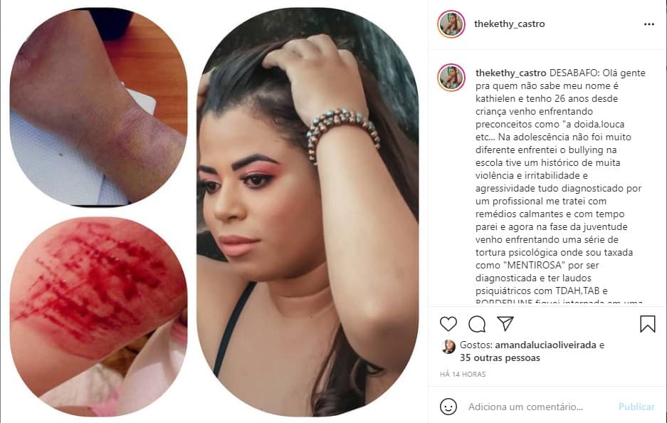 DESABAFO: Olá gente pra quem não sabe meu nome é kathielen e tenho 26 anos desde criança venho enfrentando preconceitos como “a doida,louca etc… Na adolescência não foi muito diferente enfrentei o bullying na escola tive um histórico de muita violência e irritabilidade e agressividade tudo diagnosticado por um profissional me tratei com remédios calmantes e com tempo parei e agora na fase da juventude venho enfrentando uma série de tortura psicológica onde sou taxada como “MENTIROSA” por ser diagnosticada e ter laudos psiquiátricos com TDAH,TAB e BORDERLINE fiquei internada em uma clínica psiquiatrica para o meu bem e sinceramente tenho vontade de ficar lá novamente porque aqui fora e muito mais dolorido enfrentar a psicofobia de pessoas ignorantes de achar que (é falta do que fazer,existem pessoas em piores situação,e frescura,você não tem cara de ter isso) Sou eu quem enfrento a dor por favor eu peço que me respeite o câncer e outras doenças matam o suicídio tambem.