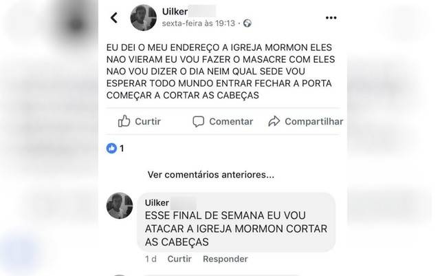 Na sexta-feira (30), Uilker tinha postado ameaças em uma rede social, falando que atacaria a congregação. “Eu vou fazer o massacre com eles […] vou esperar todo mundo entrar, fechar a porta, começas a cortar as cabeças”, escreveu.