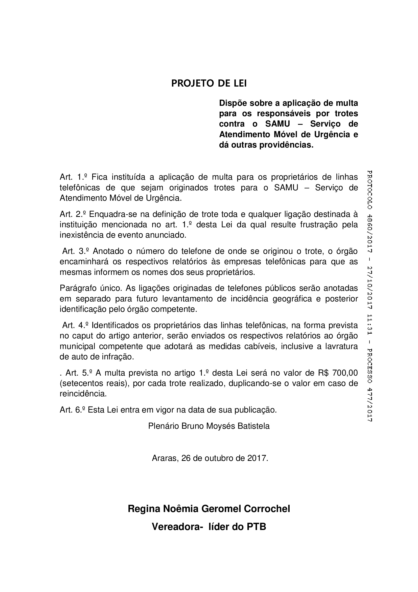 Em 2017 a Câmara Municipal de Araras (SP), aprovou um Projeto de Lei que dispõe sobre a aplicação de multa para os responsáveis por trotes contra o SAMU – Serviço de Atendimento Móvel de Urgência e dá outras providências. Leia abaixo: