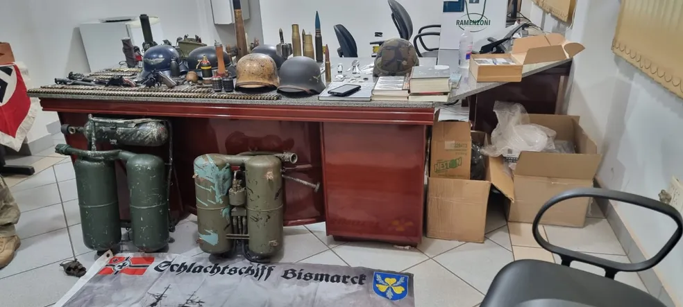 Mas por causa da quantidade de materiais que fazem apologia ao nazismo, o rapaz de 27 anos foi preso em flagrante. Arma, munições de calibres restritos, explosivos desativados, broches, capacetes, bandeiras, cilindros de gás e livros também estão incluídos no acervo localizado em um depósito.