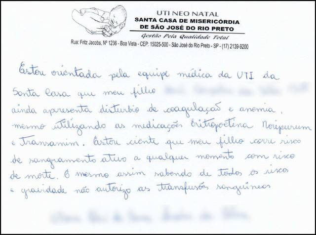 A mãe chegou até a redigir uma carta dizendo que tinha sido orientada pela equipe médica sobre a gravidade do quadro de saúde do bebê e que estava ciente de que ele poderia morrer se não fosse feita a transfusão. “Mesmo assim, sabendo de todos os riscos e gravidade, não autorizo as transfusões”, escreveu a mãe.