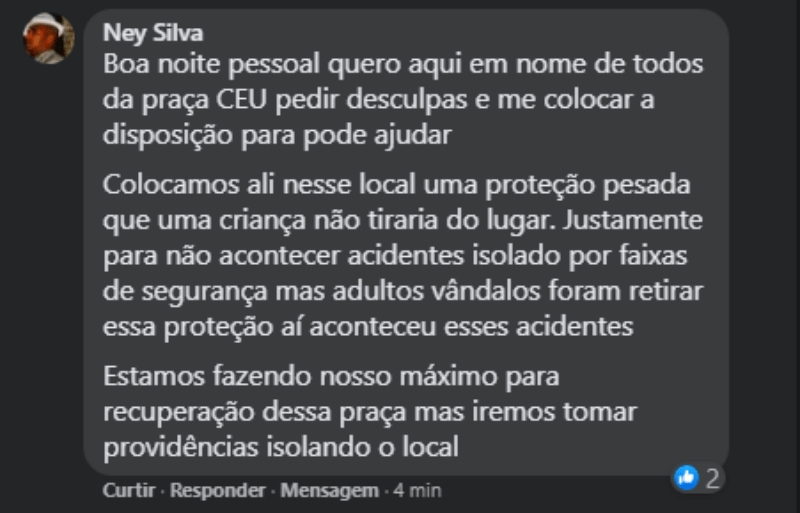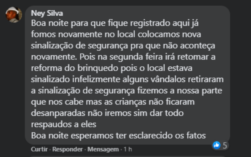 A criança foi socorrida no pronto atendimento da UPA, posteriormente foi tranferida para o Hospital São Luiz, onde passou por uma cirúrgia, e deverá passar por mais uma. Na tarde deste sábado, um adolescente de 14 anos, de nome Gabriel, também se machucou no mesmo lugar, e acabou levando cinco pontos. “Nós estamos pedido para os responsáveis pela manutenção desses brinquedos, retirem aquele ferro, pois mais alguém vai acabar se machucando”, disse Sílvia.