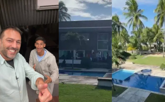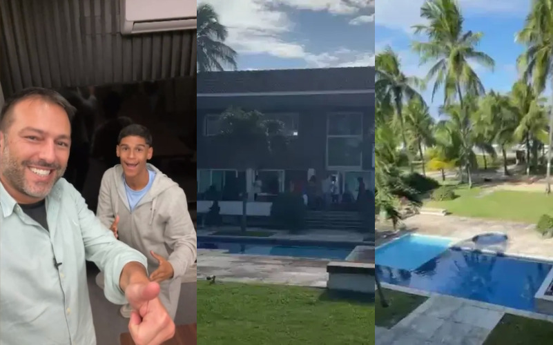 Nesta sexta-feira (1), o influenciador recebeu as chaves da casa nova acompanhado do pai e da mãe, no Litoral Sul de Pernambuco. O imóvel foi alugado pelos novos empresários, entre eles o jogador de futsal Falcão. O jovem baiano viralizou na internet após postar vídeos onde marca pênaltis em um campo de terra na zona rural de Quijingue, na Bahia. “A casa é magnífica”, disse.
