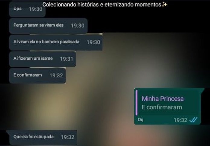 Um print enviado pela mãe mostra a conversa entre ela e uma abrigada, que foi quem a avisou sobre o caso. No diálogo, a adolescente alega que viram a menina no banheiro, paralisada, e diz que teriam feito um exame que comprovou o estrupo.