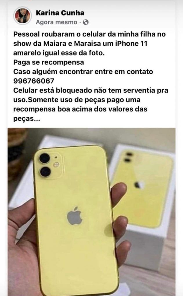 Nesta segunda-feira (15), Karina Cunha, usou as redes sociais para registrar roubo do celular Iphone 11 de sua filha durante o show de Maiara e Maraisa, ocorrido na Festa do Peão de Araras (SP). De acordo com ela, o aparelho já está bloqueado, e a família oferece recopensa para quem estiver com ele devolver. Veja postagem abaixo: