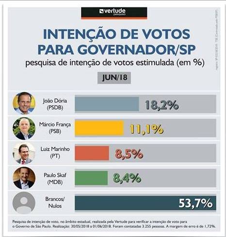 A pesquisa foi feita pela Vertude Pesquisa entre os dias 30/05 a 01/06, com 3.255 pessoas dos municípios paulistas. A margem de erro é de 1,72 %, para mais ou para menos, e nível de confiança utilizado é de 95%. O número de registro no TSE é SP-04608/2018.