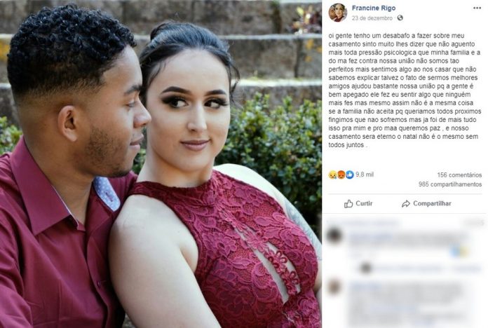“Não aguento mais toda pressão psicológica que minha família e a do Ma fez contra nossa união. Não somos tão perfeitos, mas sentimos algo ao nos casar que não sabemos explicar. Talvez o fato de sermos melhores amigos ajudou bastante nossa união, porque a gente é bem apegado. Ele fez eu sentir algo que ninguém mais fez, mas mesmo assim não é a mesma coisa”, escreveu no perfil pessoa.