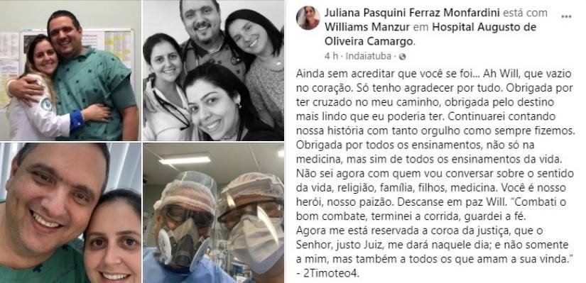 “É com profundo pesar que lamentamos a morte do Dr. Williams Elias Manzur Morillo, médico da UTI do Hospital Augusto de Oliveira Camargo (HAOC), aos 55 anos, vítima de COVID-19. Nascido na cidade de Upata (Venezuela), Dr. Williams formou-se em 1994 na faculdade de medicina na Universidade Estadual de Campinas (Unicamp) e em 2013 iniciou as atividades de médico plantonista do HAOC como emergencista e intensivista. Era casado, pai de dois filhos.
