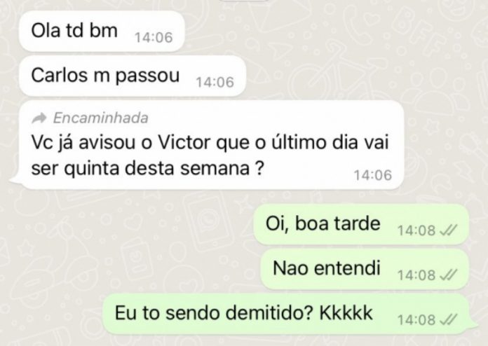 Um médico ortopedista chamado Victor Hugo Heckert utilizou as suas redes sociais na última quarta-feira, 27, para expor a maneira como foi demitido de seu emprego. De acordo com uma imagem publicada em seu Twitter, um colega de profissão lhe encaminhou uma mensagem por engano com a informação de que seu desligamento seria realizado na mesma semana. Morador de Erechim, no Rio Grande do Sul, o rapaz não entendeu a mensagem e questionou o remetente: “Não entendi, eu estou sendo demitido?”. Até o momento, a publicação conta mais de 94 mil curtidas e quase 1.300 respostas.