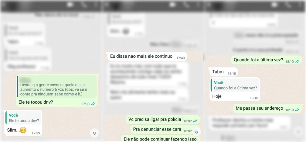 Logo depois, o professou questiona quando foi a última vez em que houve abuso, e a aluna responde “hoje” (segunda-feira). Depois da mensagem, o professor pediu ajuda a outros colegas da escola. Eles foram até a casa da menina e acionaram uma equipe da Polícia Militar que passava pelo local. A adolescente contou que sofreu abusos do pai várias vezes durante três meses, sendo a última vez na segunda-feira.