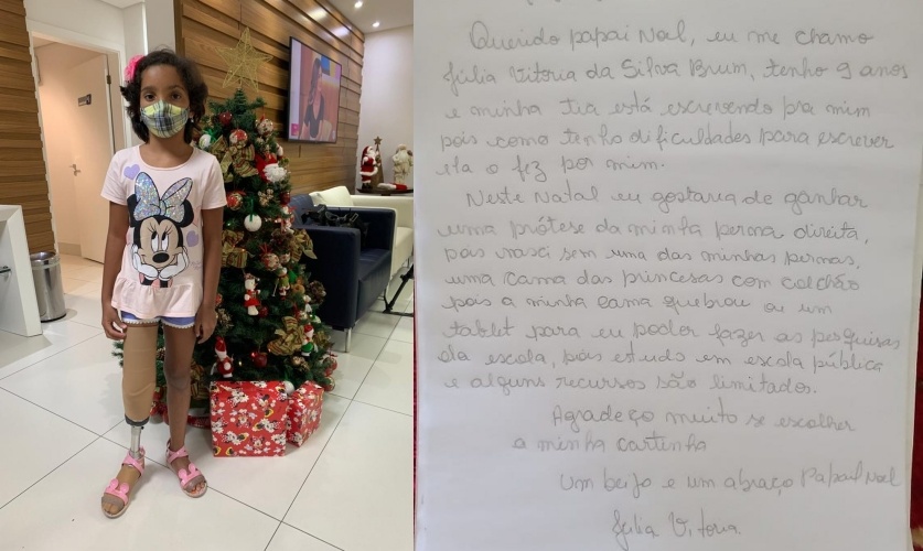 A alegria da pequena Júlia Vitória, de 9 anos, revela um sonho de Natal realizado. Moradora de Magé (RJ), a menina que nasceu com má formação na perna direita havia pedido uma prótese em cartinha para o Papai Noel, e o desejo foi atendido nesta quarta-feira (15), em uma clínica de Campinas (SP).