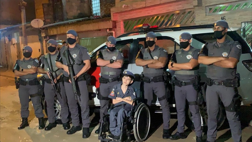 O menino Matheus Henrique Donatt da Silva, de 12 anos, morador de Guarujá, no litoral de São Paulo, realizou o sonho de ser policial militar por um dia. Diagnosticado com Atrofia Muscular Espinhal (AME), uma doença rara e sem cura, o menino explica que sempre admirou da profissão. “Eu fiquei emocionado. É muito bom poder realizar esse sonho”, afirma.