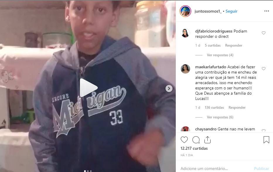 Todo o caso é compartilhado no Instagram @juntossomos1_, onde acontece contato para doações. Além disso, Aline mostra a vida da família e dá atualizações sobre o menino Lucas.