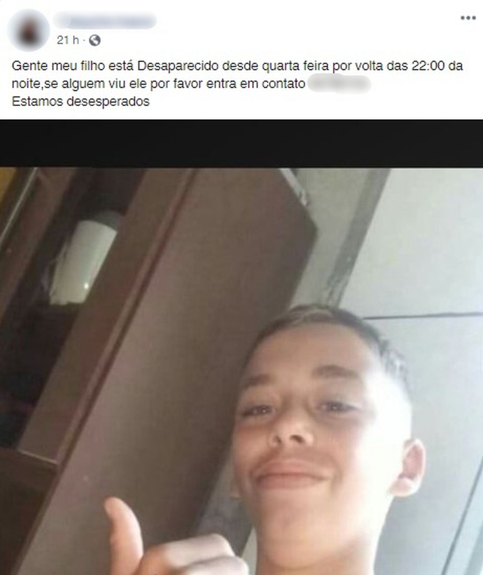 Ainda de acordo com o boletim, a mãe mencionou que dias antes ele havia caído de um cavalo e estava com um ferimento na perna direita. Ela relatou à Polícia Civil que procurou o filho na casa de familiares e amigos, sem obter retorno. Nas redes sociais, ela colocou fotos dele pedindo ajuda para encontrá-lo.