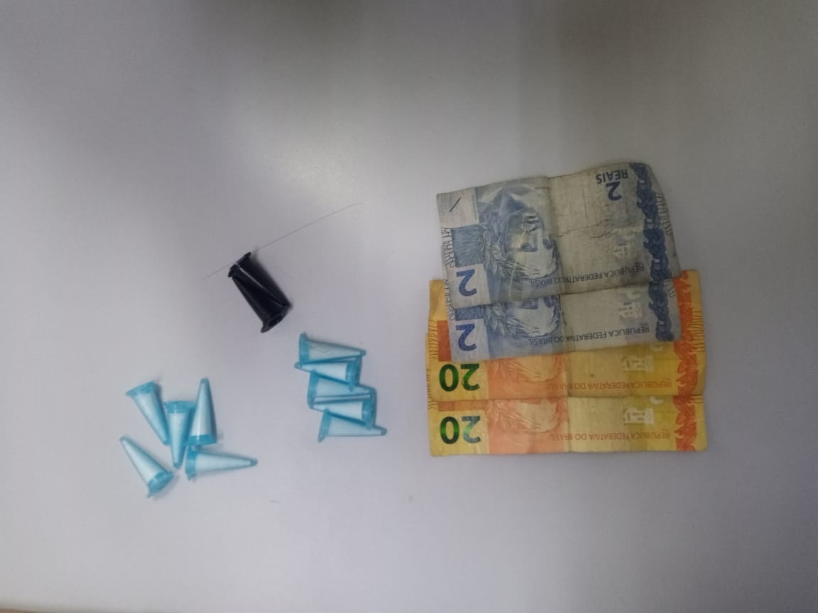 Realizada busca pessoal, foi localizado em seu bolso da blusa um total de R$44,00 reais e 12 enpendorf de cocaína. Indagado o mesmo confessou que pegou a droga para vender para um conhecido, não informando o nome do mesmo.