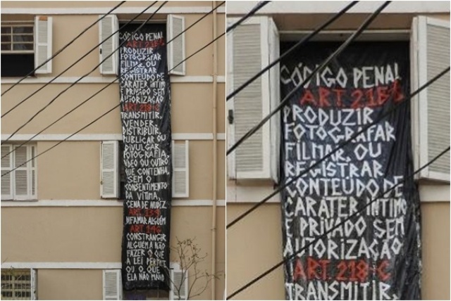 Uma moradora da região de Perdizes, na Zona Oeste da capital paulista, colocou um cartaz na janela de seu apartamento com artigos do Código Penal após ser fotografada por vizinhos em cenas íntimas e de nudez dentro de sua própria casa.