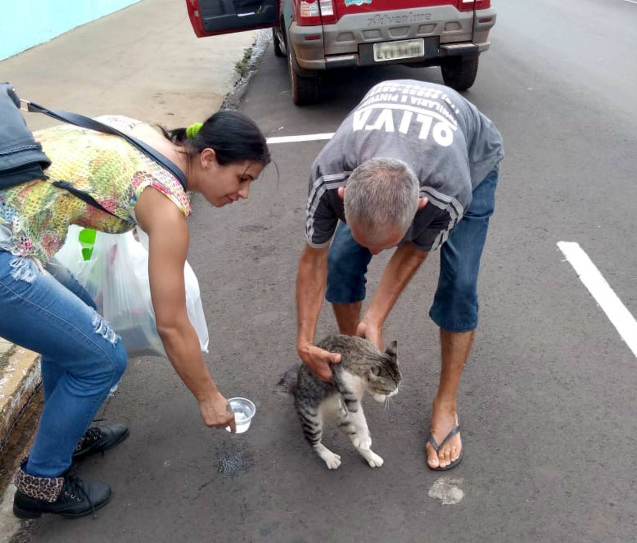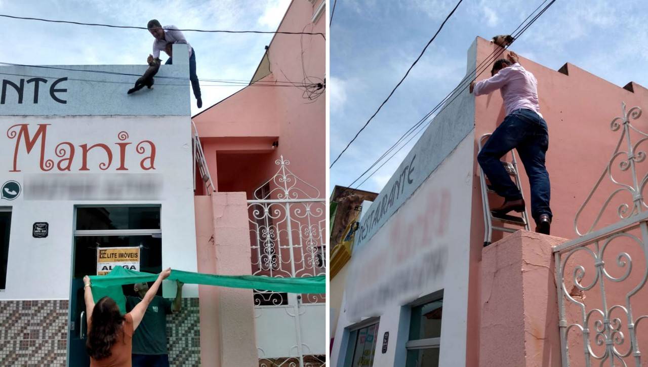 Com a ajuda de uma escada, ele chegou até o gato. Embaixo, moradores improvisaram uma rede com o uso de panos para amortecer o felino na queda. Mas a estratégia não funcionou como eles esperavam, pois o gato caiu no chão. Apesar da queda, o animal não se feriu.