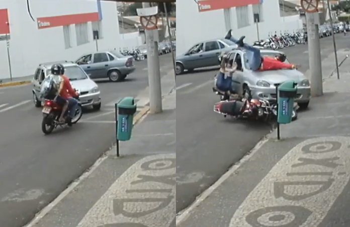 Com o impacto, o motociclista e a garupa foram arremessados da moto e caíram no chão. Câmeras de segurança flagraram o momento da batida e quando pessoas que estavam no local correm para ajudar as vítimas.