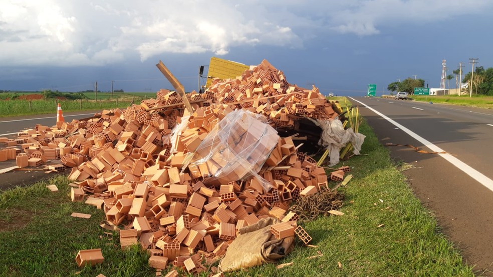 De acordo com informações do policiamento rodoviário, o caminhão estava carregado com tijolos, que ficaram espalhados pela pista e canteiro central. Duas faixas precisaram ser interditadas. As causas do acidente serão investigadas pela Polícia Civil.