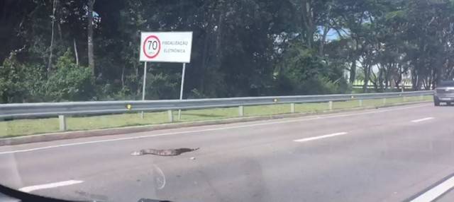 A serpente atravessou a pista e entrou em um matagal. O Corpo de Bombeiros informou que não recebeu nenhum chamado para ir resgatar o animal.