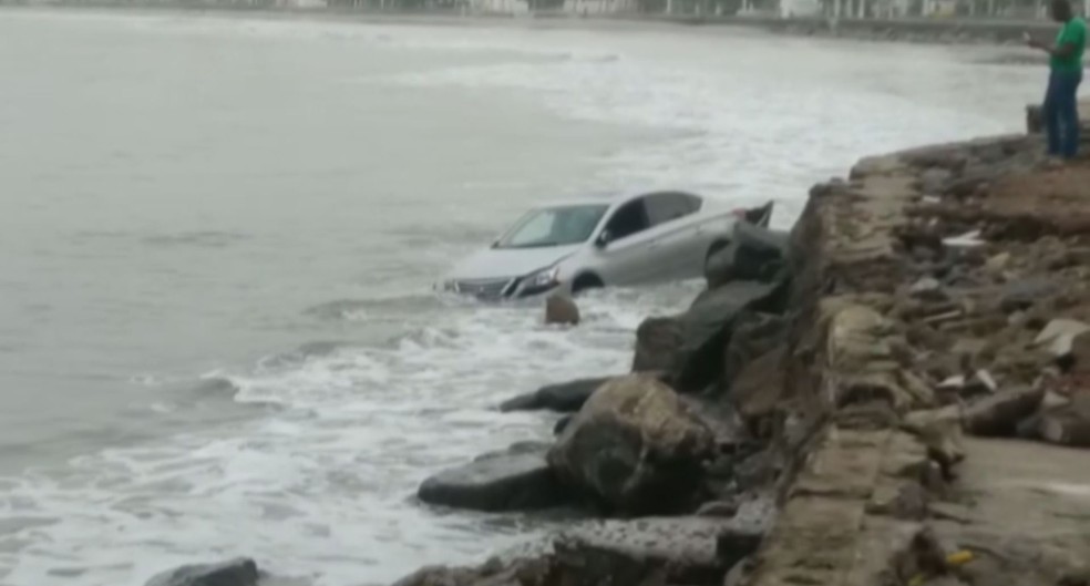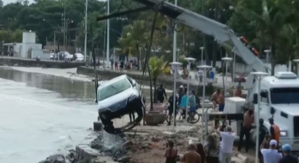 Acidente aconteceu na Praia da Enseada, em Guarujá (SP). Veículo foi retirado com apoio de um guindaste.