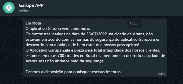 Em nota enviada ao site Repórter Beto Ribeiro, o aplicativo Garupa esclarece que os motoristas inativos na data de 26/07/2022, na cidade de Araras, não estavam em acordo com as normas de segurança do aplicativo.