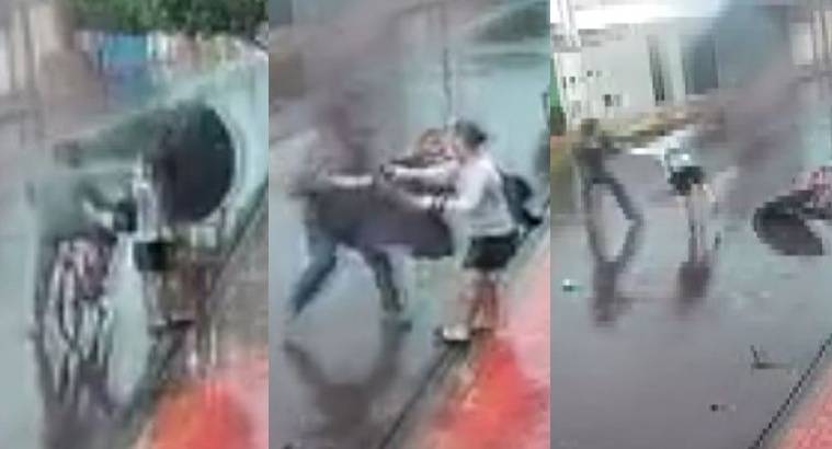 Câmeras de segurança flagraram a ação. O vídeo mostra a mulher caminhando pela Rua Antônio Vilela, no Centro, por volta das 6h. De repente, um homem de bicicleta a aborda e tenta pegar o acessório A vítima reage e começa a bater nele com um guarda-chuva.