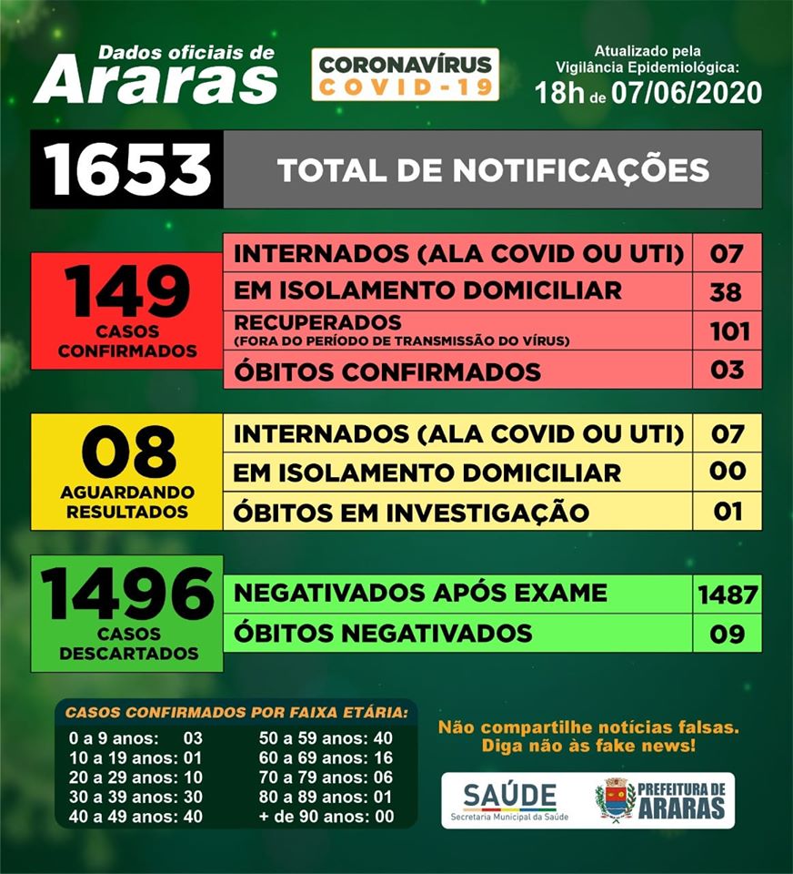 A Vigilância Epidemiológica de Araras (SP) confirmou na noite deste domingo (07) através de seu boletim diário (veja abaixo) divulgado pela Prefeitura Municipal que o município registrou até agora 149 casos de covid-19.