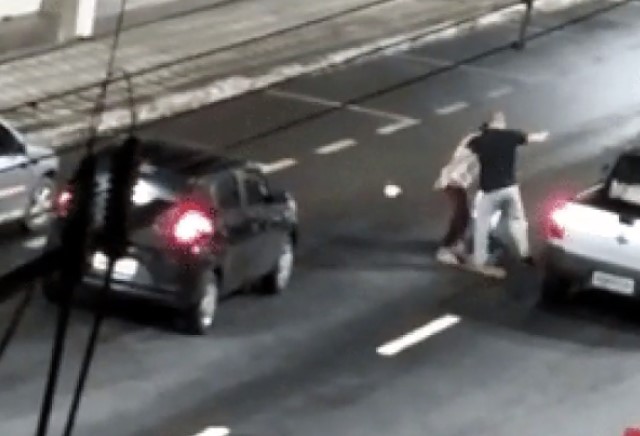 As imagens mostram esse momento da briga. De acordo com as imagens, as duas mulheres estão fora do carro. A que estava com o suspeito dá um primeiro empurrão na vítima. Em seguida, o homem termina de derrubar a agredida com um soco e chuta a cabeça dela, que está indefesa no chão. Segundo testemunhas, a motorista que iniciou as agressões rapidamente interrompe o suspeito e volta para o carro com ele.