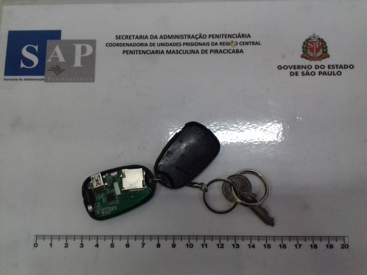 A visitante passava por revista quando agentes penitenciários suspeitaram de um chaveiro com o equipamento que parecia um controle para portão. Ao abrirem o suposto controle, eles encontraram uma placa semelhante a de um celular, com câmera e entrada para carregador.
