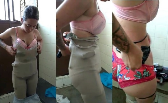 Todo o material apreendido estava grudado no corpo da mulher (vídeo abaixo), por meio de um macacão modelador, com fita adesiva, conforme o boletim de ocorrência, registrado no domingo (26).