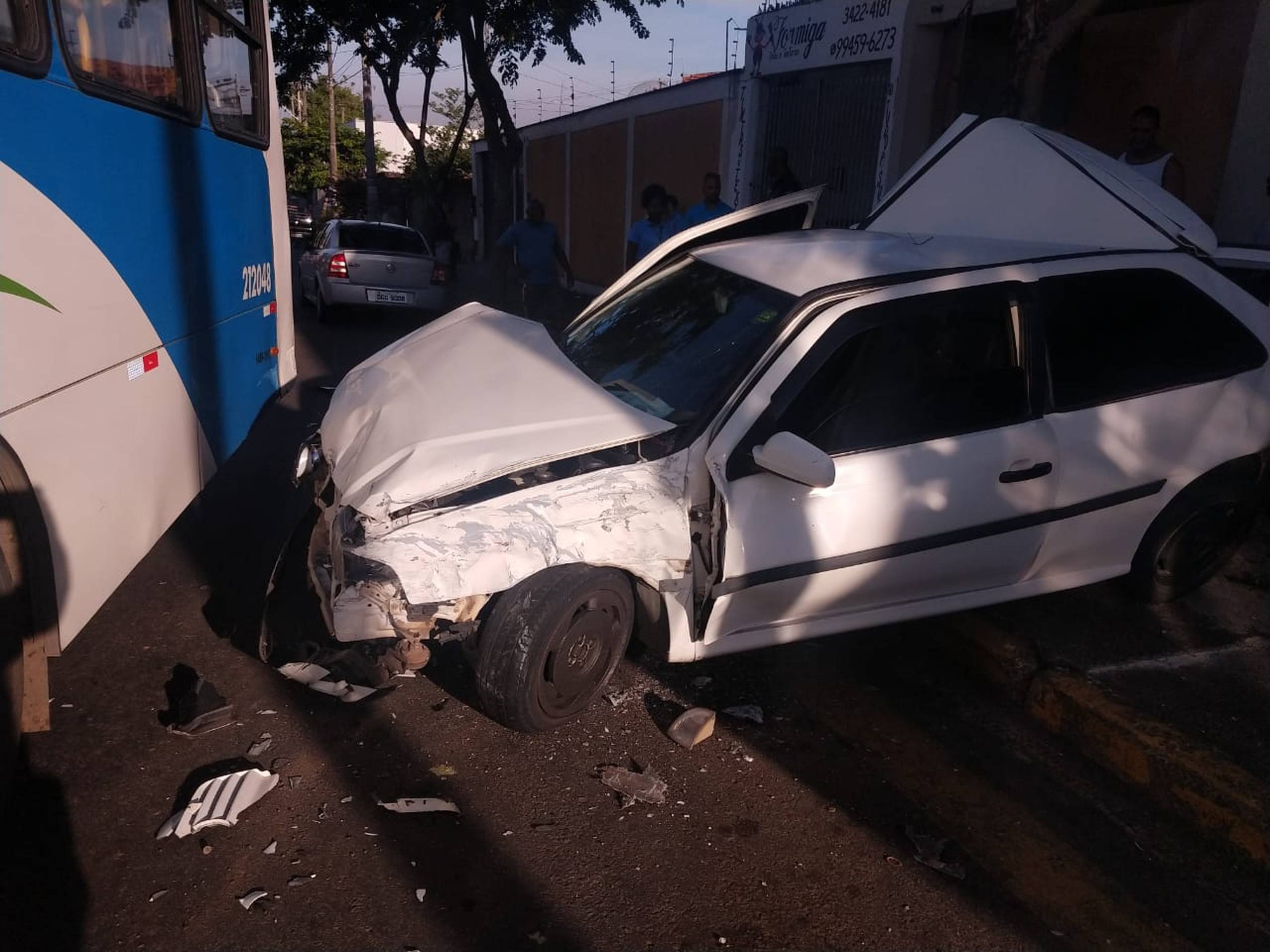 Um dos automóveis atingiu uma árvore, que teve que ser retirada pelos bombeiros. Motorista do coletivo passou mal.