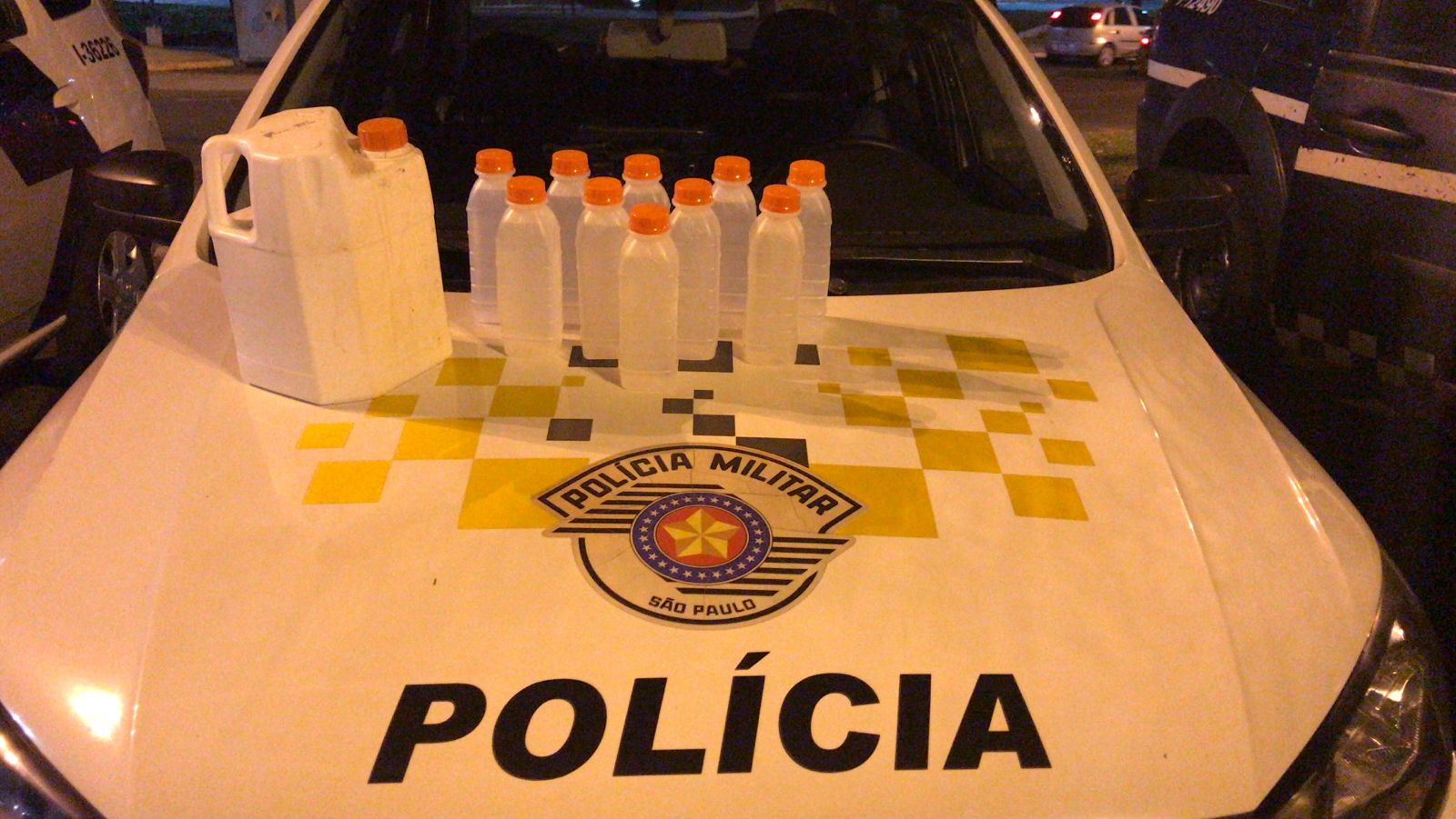 Em busca veicular foi localizado a quantia de 10 litros de lança-perfume. O passageiro assumiu a propriedade da substância. O condutor é motorista de aplicativo e alega desconhecimento.